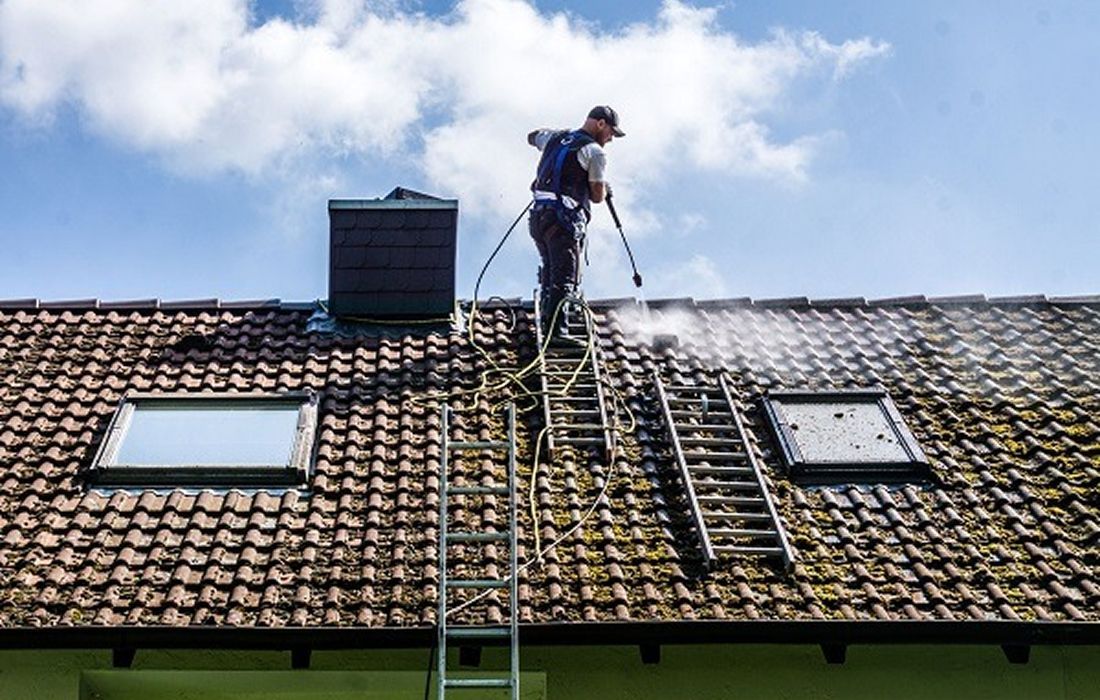- Roof surface pressure cleaned using min 3000psi to remove all excess dirt, grime, lichen and other contaminants